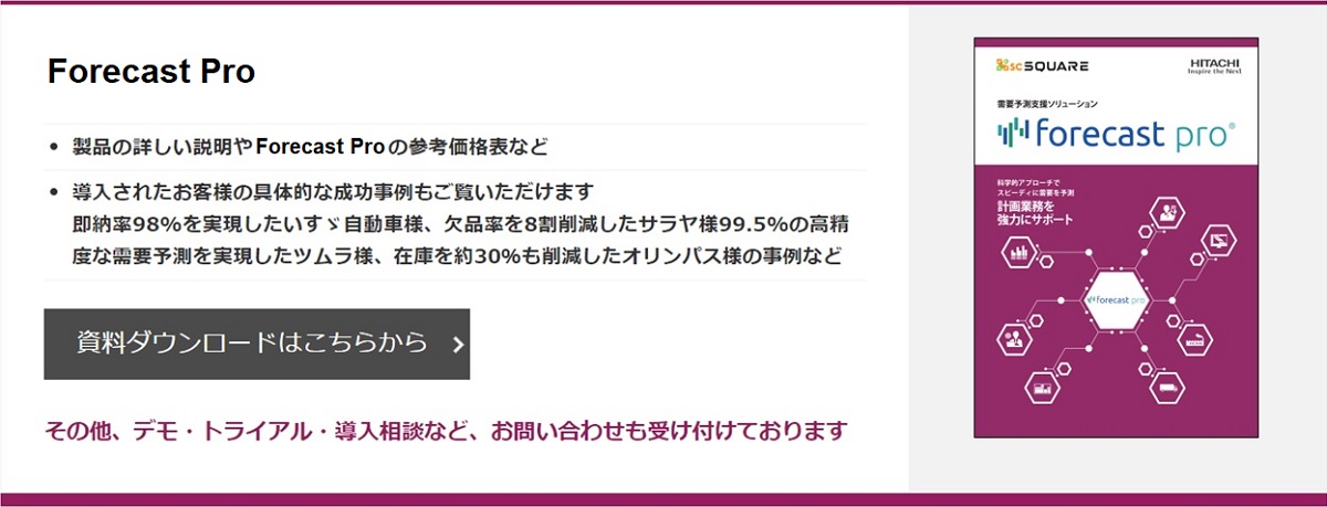 Forecast Proの特徴、予測モデルや予測機能などについて詳細にご紹介している製品概要資料や、即納率98%を実現した事例、欠品率を8割削減した事例、99.5%の高精度な需要予測を実現した事例、在庫を約30%も削減した事例などの事例集をお申込みいただけます。
